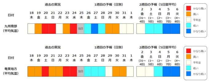 九州南部・奄美地方の向こう2週間の気温は、12月28日頃までは寒気の影響で低く、かなり低い所もあるでしょう。その後は暖かい空気に覆われやすいため平年並か高いですが、1月3日頃からは冬型の気圧配置が強まり、強い寒気の影響を受けやすいため、かなり低くなる可能性があります。