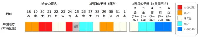 中国地方の気温は、向こう3日間程度は平年並か低いですが、その後は暖かい空気に覆われやすいため、12月30日頃までは高いでしょう。1月3日頃からは強い寒気が流れ込むため低く、かなり低くなる可能性があります。また、1月3日頃からは、山陰を中心に降雪量がかなり多くなる可能性があります。