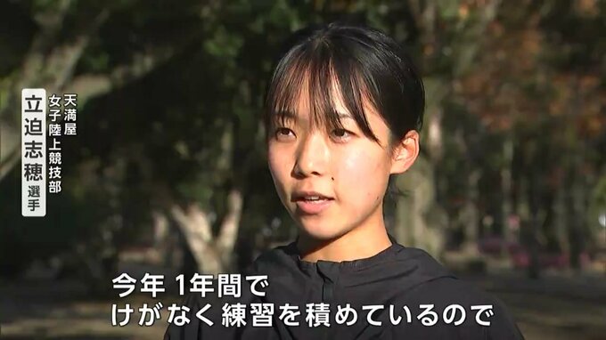 レース前に意気込みを語る天満屋女子陸上競技部の立迫志穂(たちざこ・しほ)選手です。期待のルーキーは今年の新人でただ1人アメリカの高地合宿に参加したり、11月の記録会では5キロの自己ベストもマークしたりと着実に成長してきました。地元の応援を力に日本人上位入賞を狙います。