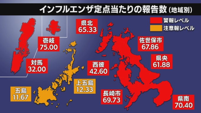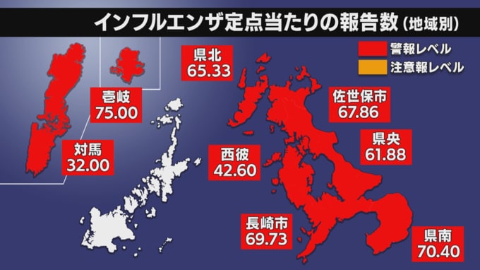 地域別では壱岐が最も多く、長崎市や佐世保市など8つの地区で警報レベル、五島・上五島の2つの地区で注意報レベルとなっています。