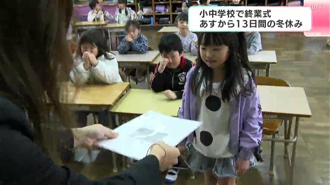 式の後、2年3組の教室では、担任の先生からひとりひとりに2学期のがんばりへのほめ言葉と一緒に通知表が手渡され、子どもたちはうれしそうに受け取っていました。