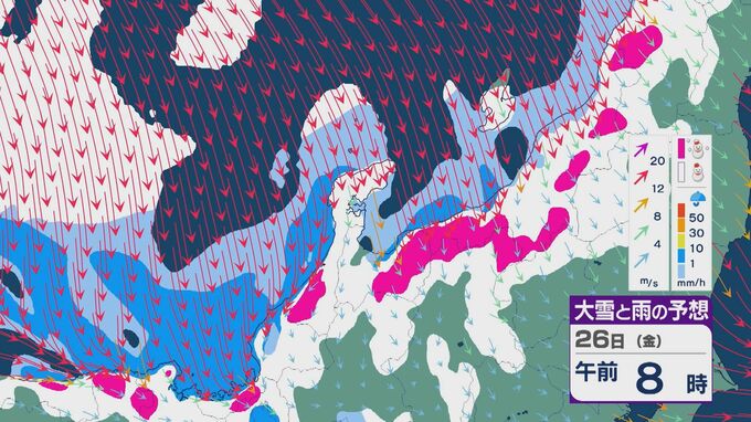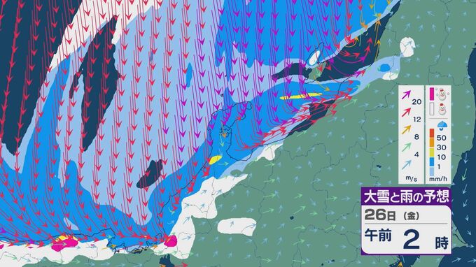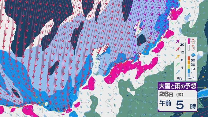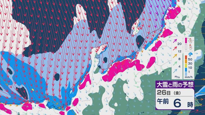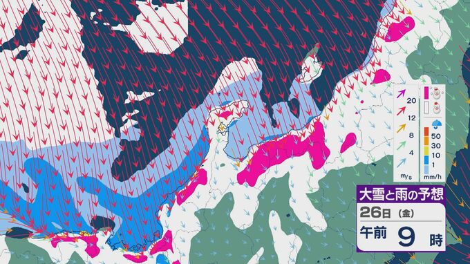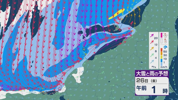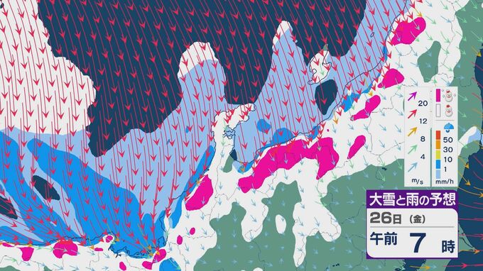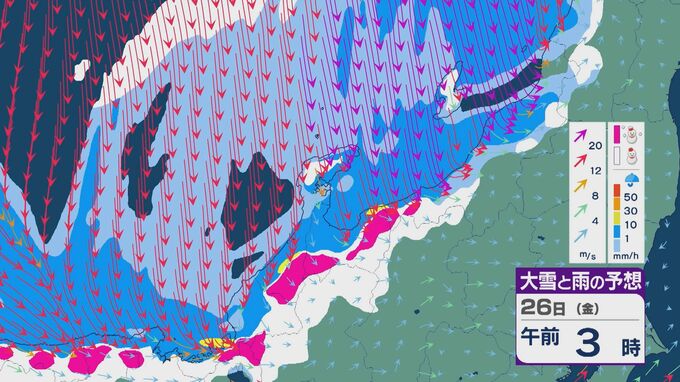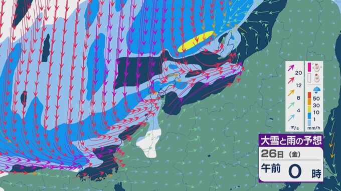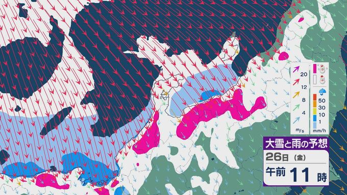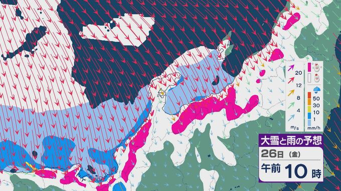 【大雪情報】26日(金)は“強い冬型”と“強い寒気”で石川県内は暴風と大雪に警戒を 24時間予想降雪量は加賀の山地で50センチ 加賀・能登の平地でも5センチ 雪と風シミュレーション 北陸放送 2025年12月25日(木) 17:36 国内 26日の雪と風の予想ですが、未明から北よりの風が強く雪雲がかかるでしょう。