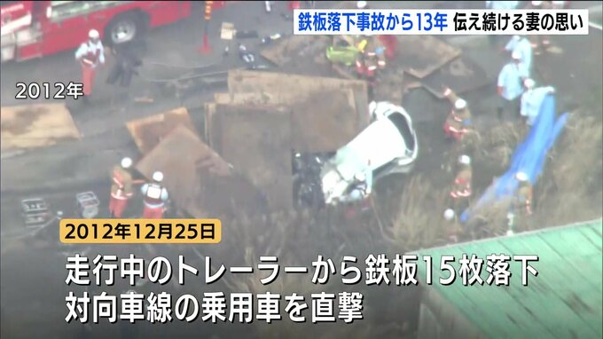 2012年のクリスマスの朝、走行中のトレーラーから1枚800kgの鉄板15枚が落下し、対向車線の乗用車を直撃。この事故で乗用車に乗っていた松本さんの夫・康志さんが亡くなりました。