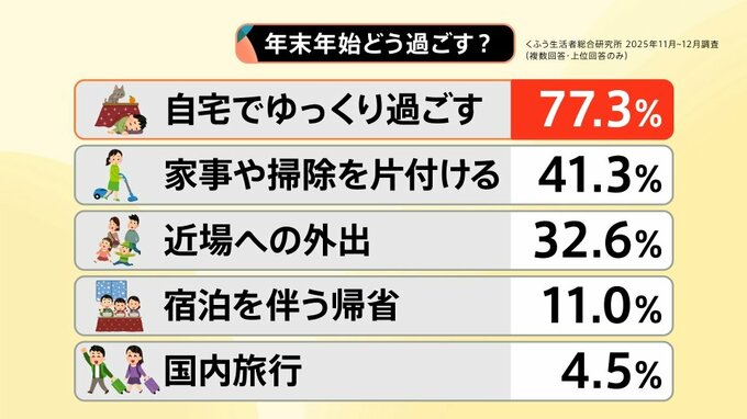 年末年始をどのように過ごすのか聞いたアンケートによると、「宿泊を伴う帰省」と答えた人は11.0%で、なんとなく少ないように感じます。また、77.3%の人は「自宅でゆっくり過ごす」と回答しているということです。