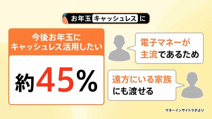 マネーインサイトラボによると、「今後お年玉にキャッシュレスを活用したい」という人は約45%で、理由としては「電子マネーが主流であるため」「遠方にいる家族にも渡せる」といったことがあげられるといいます。