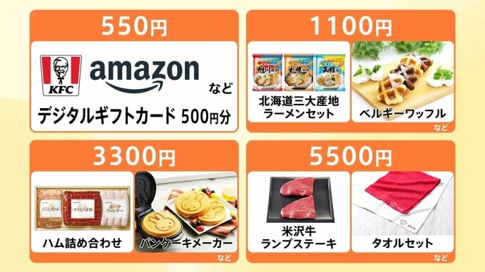 値段に応じていくつかの選択肢があり、Amazonのギフトカードや、パンケーキセット、米沢牛のランプステーキなどを選ぶことができるということです。