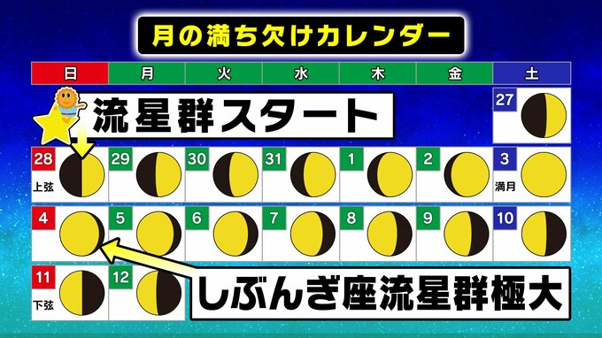 「月の満ち欠け」と「しぶんぎ座流星群」の出現時期です。