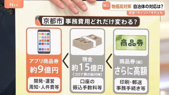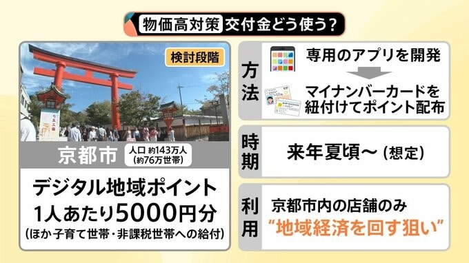 京都市では、アプリを開発して、市内の店舗のみで使えるデジタル地域ポイントの配布を検討しているということです。