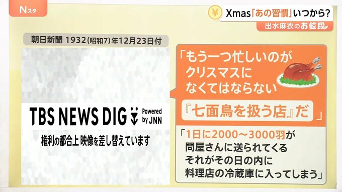 続いて、1932年(昭和7年)12月23日の朝日新聞では、「天が下は総動員 クリスマスの歓喜 我国でも今や全く年中行事に 華やかな催しに祝ふ」とクリスマスが表現されています。