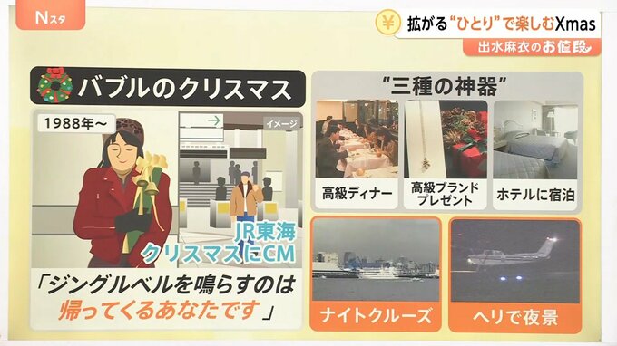 1988年、JR東海が東海道新幹線をテーマにクリスマスにCMを制作し、「ジングルベルを鳴らすのは帰ってくるあなたです」といったキャッチコピーが世の若者たちをひきつけて、「恋人同士でクリスマスを過ごす」という新たな文化を生みました。