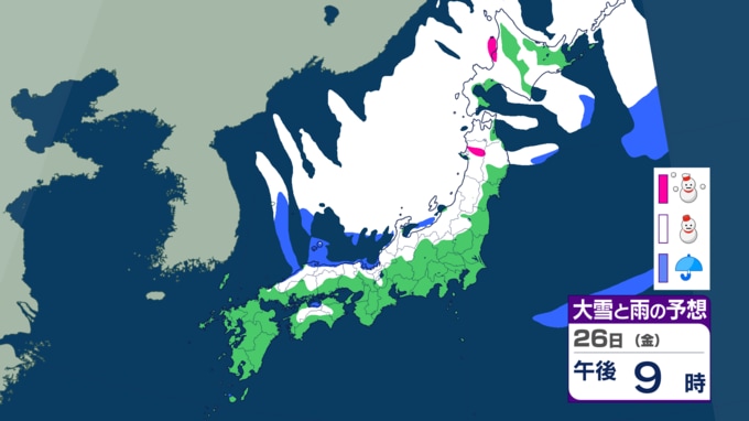 気象庁によりますと、26日(金)は発達する低気圧と強い冬型の気圧配置の影響で、西日本から北日本の広い範囲で「大荒れ」となる見込みです。