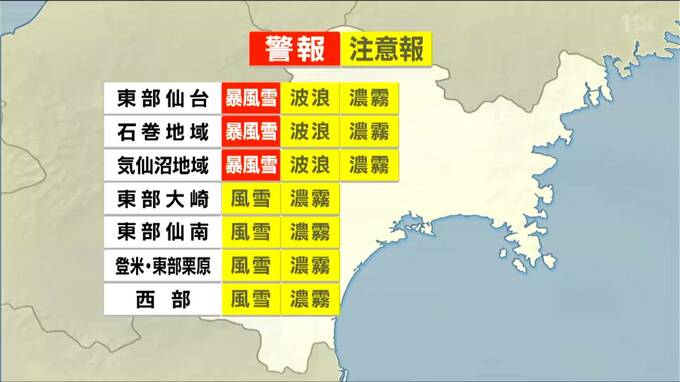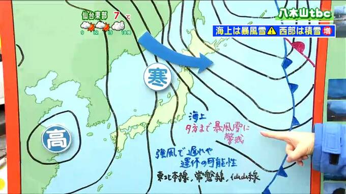 12月26日金曜日の宮城県内は、この後強い冬型の気圧配置に変わり、西寄りの風が急速に強まる見込みです。沿岸部では既に暴風雪警報が発表されており、海上では非常に強い風と高波に警戒が必要です。東部の陸上でも暴風雪警報が発表される可能性があります。(2025年12月26日午前7時45分頃の情報)
