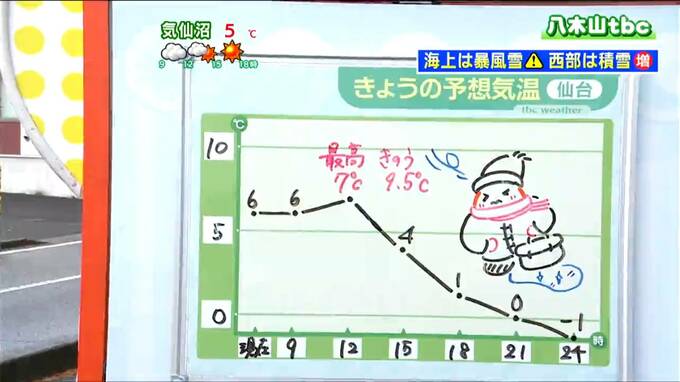 午後は気温が下がるペースが早く、今夜に忘年会という方も多いかと思いますが、午後9時頃になると仙台市中心部でも0℃くらいまで下がってきそうです。降った雪が凍りつくところも出てくるかもしれません。