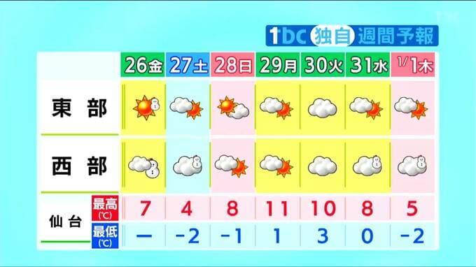 27日も西部の山沿い中心に雪が降りやすいですが、日曜日から火曜日にかけては晴れや曇りで、年末年始の買い出しなどにはまずまずの天気となりそうです。