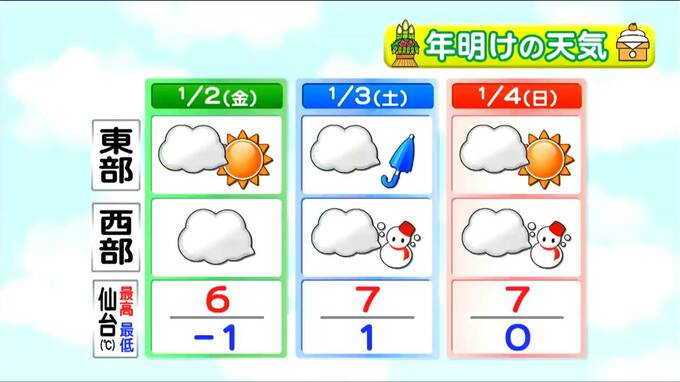 2日から4日にかけての予報では、2日に天気が崩れそうという予報から1日遅れて、3日に雨や雪が降りそうです。宮城県内も仕事始めの辺りから寒さがまたちょっと厳しくなる可能性もありますので、体調管理にも注意していきましょう。