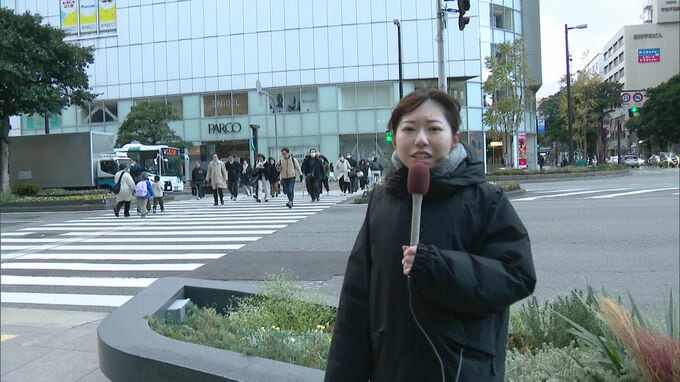 「午前8時頃ごろの天神です。肌を突き刺すような強く冷たい風が吹き、とても寒いです。街の人も足早に通り過ぎている様子が見られます」