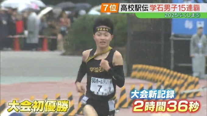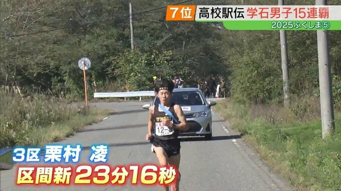さらに、3区でももう1人のエースの栗村凌が圧倒的な走りをみせ、こちらも23分16秒の区間新記録。7人全員が区間賞でタスキをつないだ学法石川男子は、2時間2分58秒の大会新記録で15連覇を果たしました。