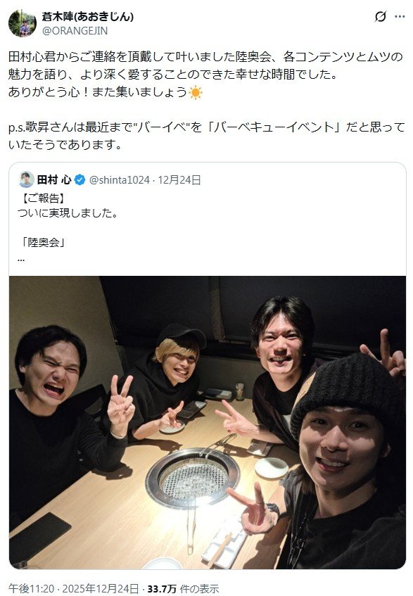 蒼木さんも「田村心君からご連絡を頂戴して叶いました陸奥会、各コンテンツとムツの魅力を語り、より深く愛することのできた幸せな時間でした。ありがとう心!また集いましょう」と陸奥会を振り返ると「p.s.歌昇さんは最近まで"バーイベ"(バースデーイベント)を「バーベキューイベント」だと思っていたそうであります。」と歌昇さんのお茶目な一面を明かしました。