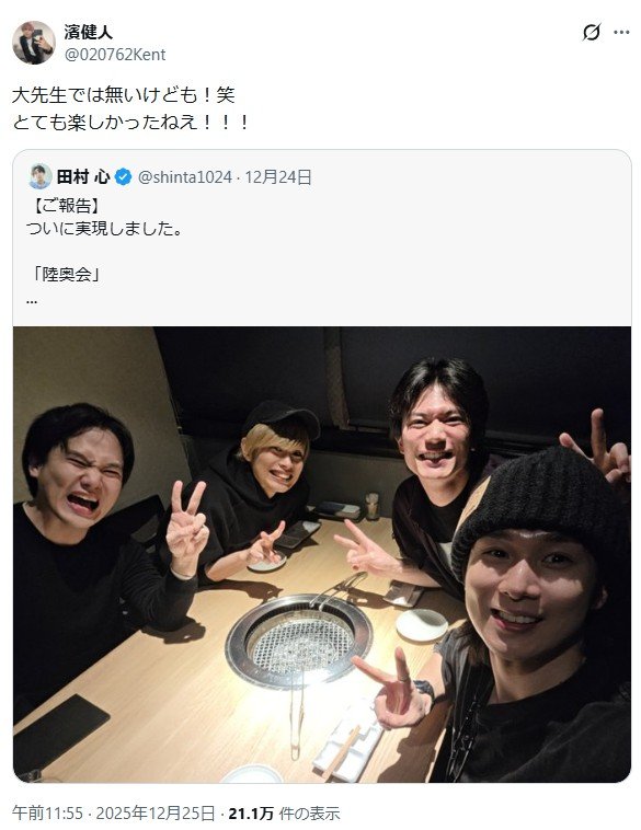 田村さんは「【ご報告】ついに実現しました。「陸奥会」」と題すると声優の濱健人さん、俳優の蒼木陣さん、歌舞伎俳優の中村歌昇さんと4人で食事をしている様子を投稿。