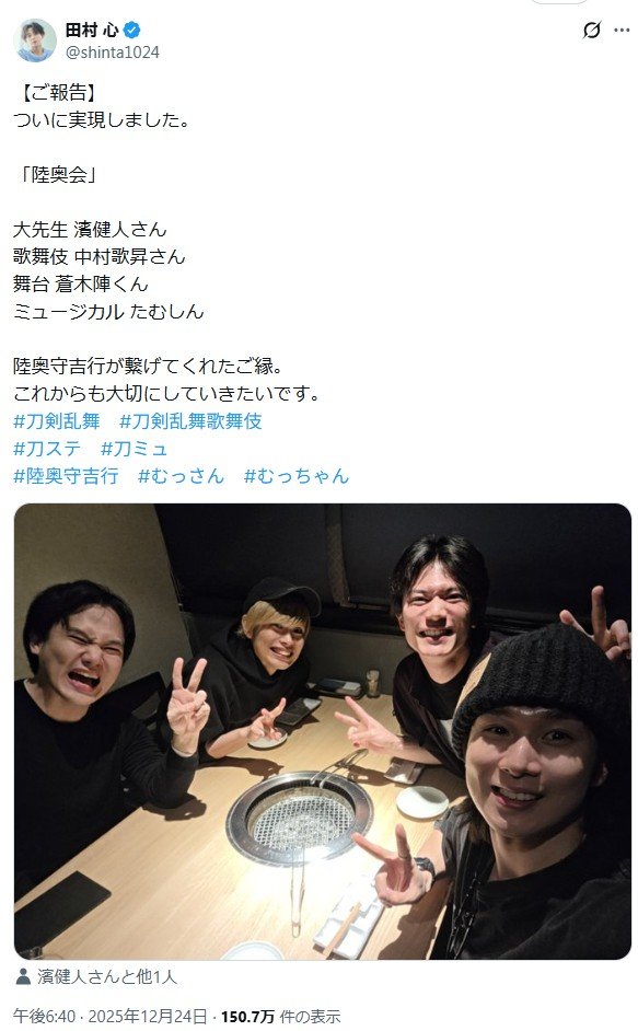俳優の田村心さんが24日に、自身のXを更新。『刀剣乱舞』シリーズで陸奥守吉行を演じている4人が集まり、「陸奥会」をしたことを報告しました。