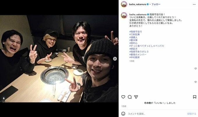 また、歌昇さんは自身のInstagramで「陸奥守吉行会!ついに全員集合。企画してくれてありがとう!」と報告。続けて、「全員私の先生で、憧れの人達前にして緊張しました。引き続き仲良くしてもらえると嬉しいなぁ。ありがとう!」とすっかり仲良くなった様子。ハッシュタグでも「#ずっと食べてずっとしゃべってた#師匠方#陸奥守ありがとう#最高のメンバー」と付けると、今回の「陸奥会」の開催で4人の絆が深まったようでした。
