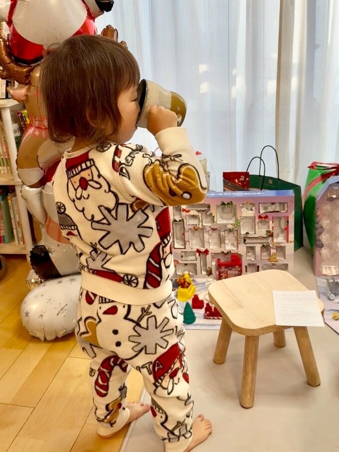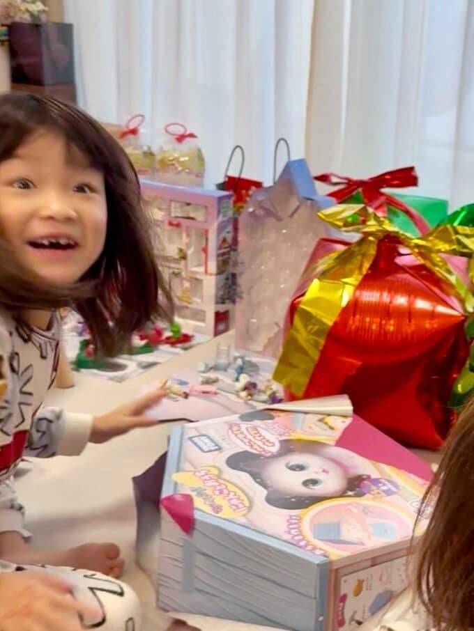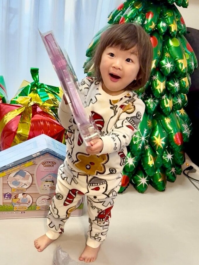 アカウントでは「我が家にもサンタさんがきました」と投稿。ののちゃんは、自宅のリビングとみられる部屋で、包装紙を開けて現れたおもちゃのプレゼント箱に、うれしそうな表情を浮かべています。