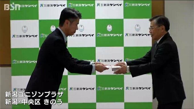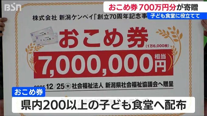 今年創立70周年を迎えた新潟ケンベイは記念事業として、県社会福祉協議会におこめ券700万円相当を寄贈しました。
