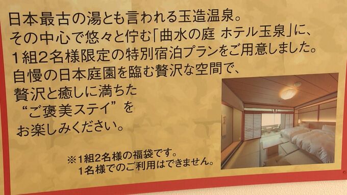 今年は婦人雑貨や生活用品など、1,000円台~15万円台の福袋約1万2,000点を用意。44万円相当の高級羽毛布団が入った福袋は15万円、およそ9,000円分の婦人雑貨のセットは3,300円で販売されます。また、最近は温泉宿泊プランや能の鑑賞チケットといった「体験型の福袋」も人気だということです。