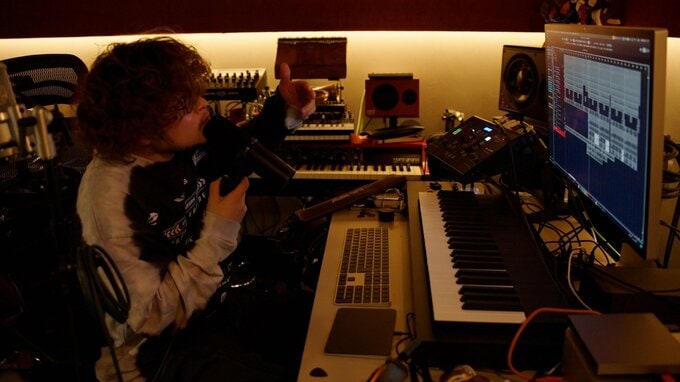第1夜では、国内での楽曲制作から全国ツアーの舞台裏に密着。プライベートスタジオで見せたのは、ドラムのリズムから一人で緻密に音を積み上げていく地道な作業だ。
