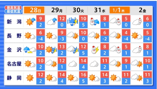 【早期天候情報】日本海側の広範囲で1月上旬から大雪に...東北日本海側、北陸、長野県、群馬県、岐阜県、近畿日本海側、山陰 気象庁発表 全国の天気を地方ごとに テレビユー山形 2025年12月26日(金) 16:31 国内 ■全国の天気を地方ごとに 画像はTBS NEWS DIG Powered by JNNより 画像ありの記事を最初から https://newsdig.tbs.co.jp/articles/-/2373820?display=1