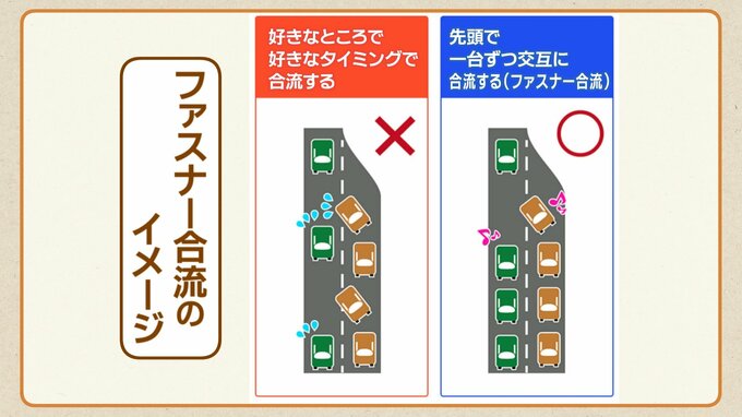 この合流方法は “ファスナー合流” と呼ばれ、規則正しく1台ずつ交互に、ファスナーのように合流する方法です。渋滞緩和の実績も上げています。