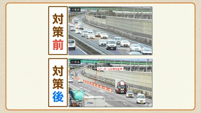 NEXCO中日本が2019年に行った調査によると、当時2車線の合流地点でラバーポールを合流車線の先頭まで延ばし、「ファスナー合流」を促したところ、運用開始前と比較して交通量全体は横ばいだったにもかかわらず、渋滞による損失時間が約3割も減少しました。