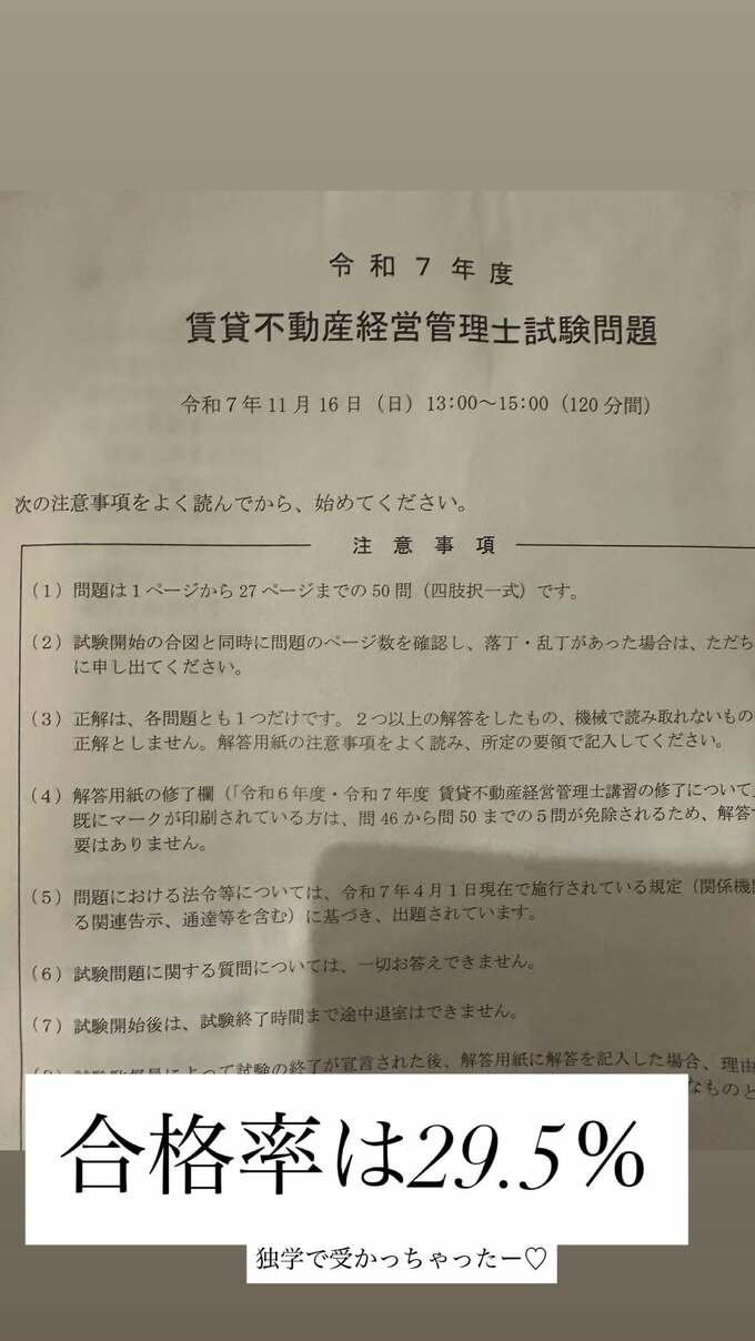 天月さんは「賃貸不動産経営管理士」「宅建終わってから2週間で独学で勉強し」「宅建と同じく5問免除なしで一発合格しました!!」と、猛烈な勢いで2つめの資格を取得したことを報告しています。