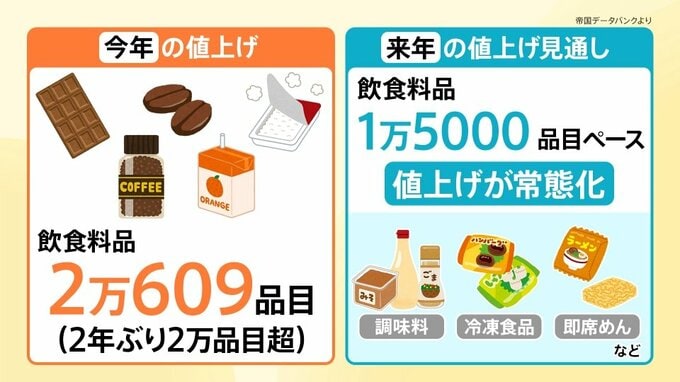 帝国データバンクによると、2026年も飲食料品は1万5000品目ペースで値上げされると予想されていて、値上げが常態化するとみられています。