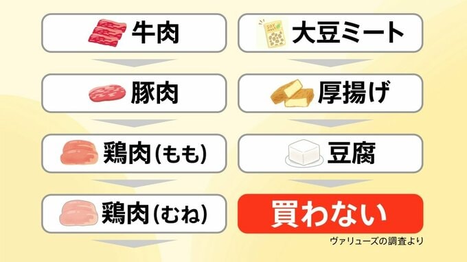 牛肉→豚肉→鶏肉(もも)→鶏肉(むね)→大豆ミート→厚揚げ→豆腐→「買わない」