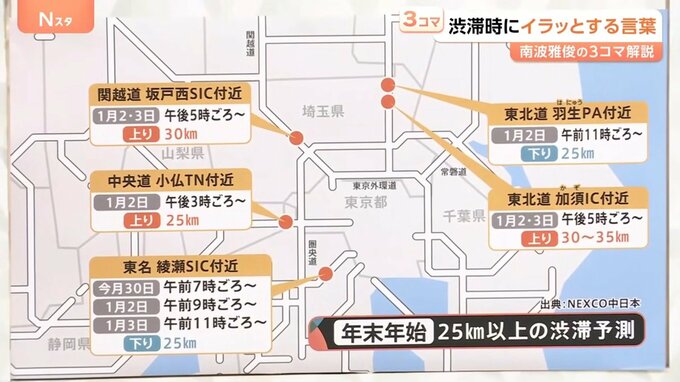 27日から休みという方も多いと思いますが、「イライラのリスク」は年末年始にも潜んでいます。高速道路の渋滞です。1月2日、3日はどの高速も25〜35kmの渋滞が予測されています。
