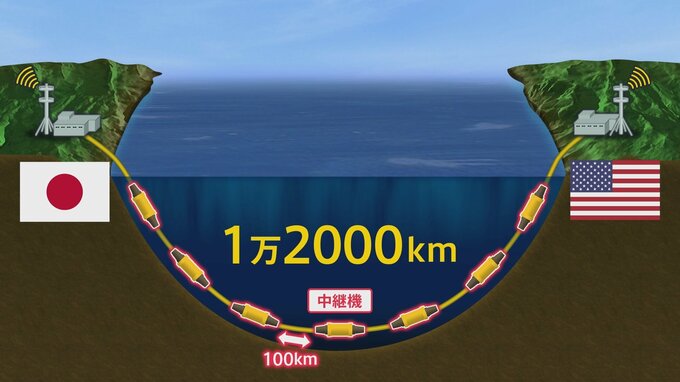 たとえば、日本とアメリカを結ぶ海底ケーブルはおよそ1万2000km。約100kmごとに「中継機」を接続し、光信号の減衰を防ぎながら太平洋を横断している。