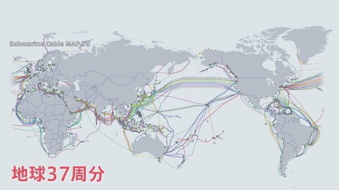 世界中に張り巡らされた海底ケーブルの地図を見ると・・・その総延長距離は約148万km、地球37周分に相当する。