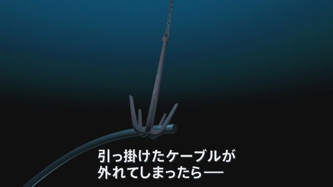 最も大変なのはせっかく引っかけたケーブルが途中で外れてしまうこと。ケーブルは海流に流され、どこに行ったのか分からなくなる。