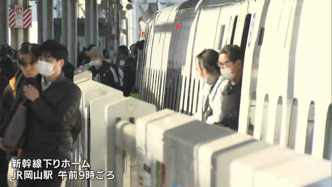 JR岡山駅の新幹線下りホームには、朝から大きな荷物を持った家族連れらが次々と降りてきました。
