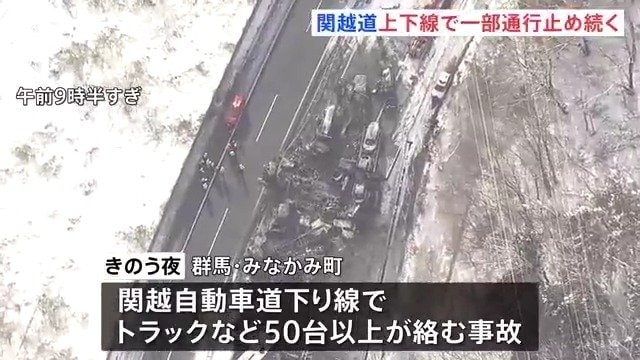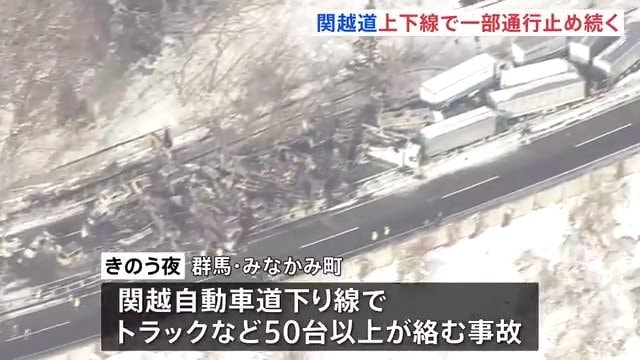 きのう夜、群馬県みなかみ町の関越自動車道下り線でトラックなど50台以上が絡む事故があり、現在も湯沢インターチェンジと月夜野インターチェンジの間の上下線で通行止めが続いています。