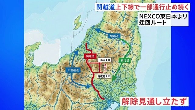 帰省に影響も…解除の見通し立たず 群馬・みなかみ町の関越道50台以上の事故で通行止め続く NEXCO東日本は迂回を呼びかけ TBSテレビ 2025年12月27日(土) 12:15 国内 解除の見通し立たず・・・NEXCOは迂回を呼びかけ 解除の見通しは立っておらず、NEXCO東日本は上信越自動車道や磐越自動車道などのルートで迂回するよう呼びかけています。