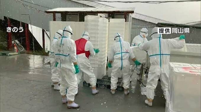 この養鶏場では今月19日、岡山県では今シーズン初めて高病原性鳥インフルエンザの疑いが判明し、20日に遺伝子検査で発生が確定、岡山県が延べおよそ3100人で殺処分などの作業を進めてきました。