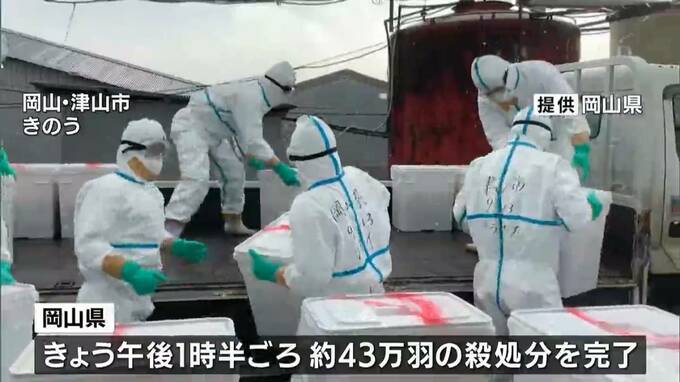 岡山県によりますと、津山市の養鶏場で行われていたおよそ43万羽の殺処分はきょう午後1時半ごろ、完了したということです。