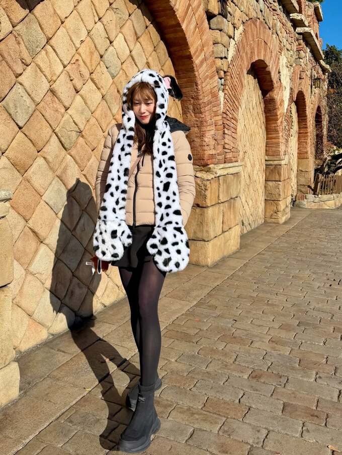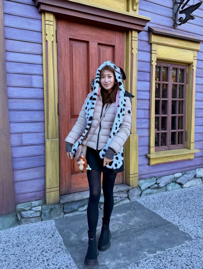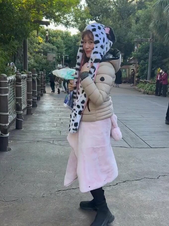 中川さんは妹と東京ディズニーリゾートを訪れたとのこと。写真では映画「101」やアニメ作品「101匹わんちゃん」のダルメシアン柄の耳付きマフラーをかぶり、ベージュのダウンジャケットに黒のミニとタイツにブーツという “おしゃれはガマン” を地で行くコーデの中川さんは「気合い入れてミニ丈で臨んだらさむすぎて」と案の定。