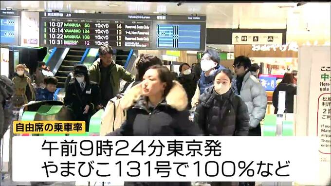 JRによりますと東北新幹線の下りは東京ー仙台間の指定席が午後5時頃までほぼすべて満席となっています。また、自由席の乗車率は午前9時24分東京発のやまびこ131号で100%など混雑しています。JRでは混雑のピークを今月30日と見込んでいます。