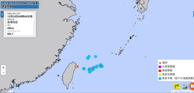 12月28日午前0時6分頃、台湾付近を震源地とする地震があり、気象庁は津波予報(若干の海面変動)を発表しました。