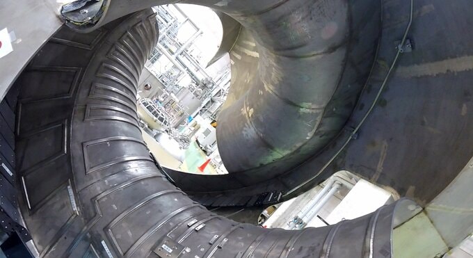 「ヘリカル方式」の特徴は、超電導コイルの作用で、外側から形成した磁場でプラズマを浮かせて閉じ込められることにあります。