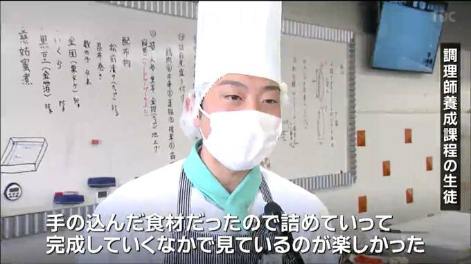 調理師養成課程の生徒:「手の込んだ食材だったので詰めていって完成していくなかで見ているのが楽しかった。」