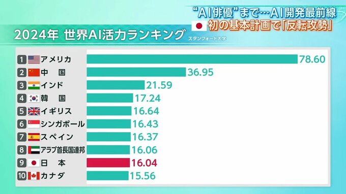 スタンフォード大学がまとめたAIの研究・投資・人材などを評価した国別ランキングでも、日本は9位どまり。